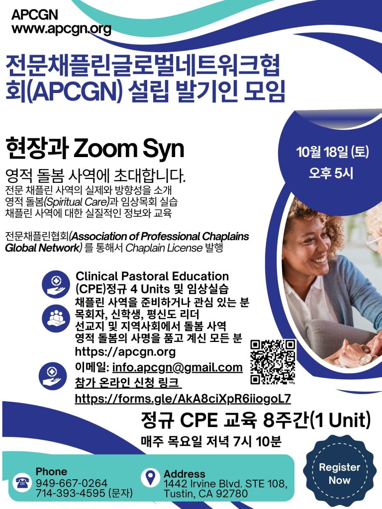 【터스틴, 캘리포니아】– 병원, 사회복지시설, 교정기관, 군부대, 교육기관 등 다양한 현장에서 영적 돌봄(Spiritual Care)을 담당하는 채플린 사역자들의 전문성과 협력을 강화하기 위한 전문채플린글로벌네트워크협회(Association of Professional Chaplains Global Network, APCGN.org) 설립 발기인 모임이 오는 2025년 10월 18일(토) 오후 5시, 1442 Irvine Blvd. STE 108, Tustin, CA 92780현장과 온라인으로 함께 열린다.